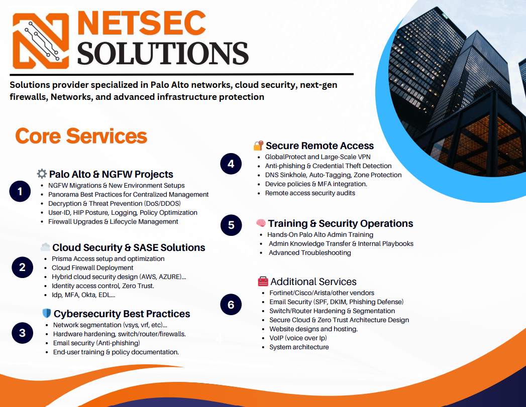 Discover how NetSec Solutions helps secure your business with Palo Alto Networks expertise, cloud security, next-gen firewalls, and advanced infrastructure protection. Download our detailed service brochure to explore our full range of cybersecurity and IT solutions.