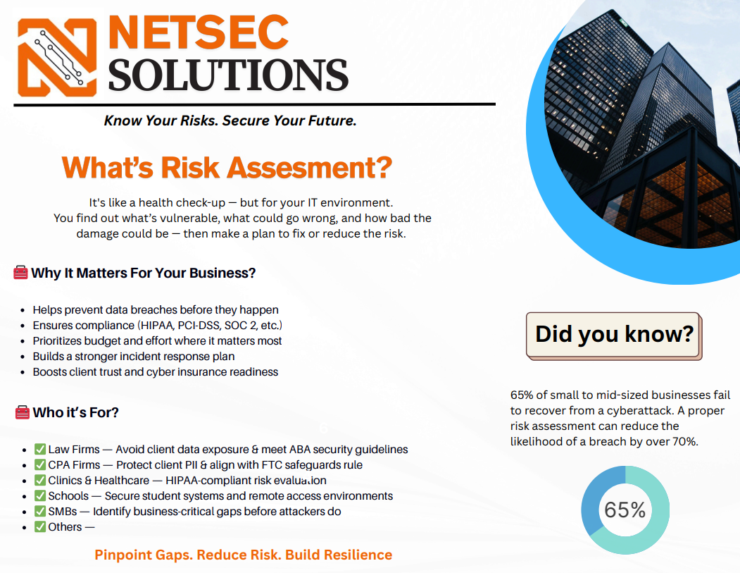 Cyber threats evolve every day, and businesses of all sizes are vulnerable. Our Risk Assessment brochure explains how we help identify security gaps, ensure compliance (HIPAA, PCI-DSS, SOC 2), and reduce breach risks by over 70%.