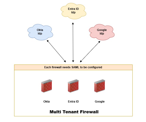 If a business uses multiple apps or firewalls as multi-tenants, the IT team will need to connect each one separately to its IdPs, such as Azure AD, Okta, or Google. And that’s a lot of extra setup and headaches.